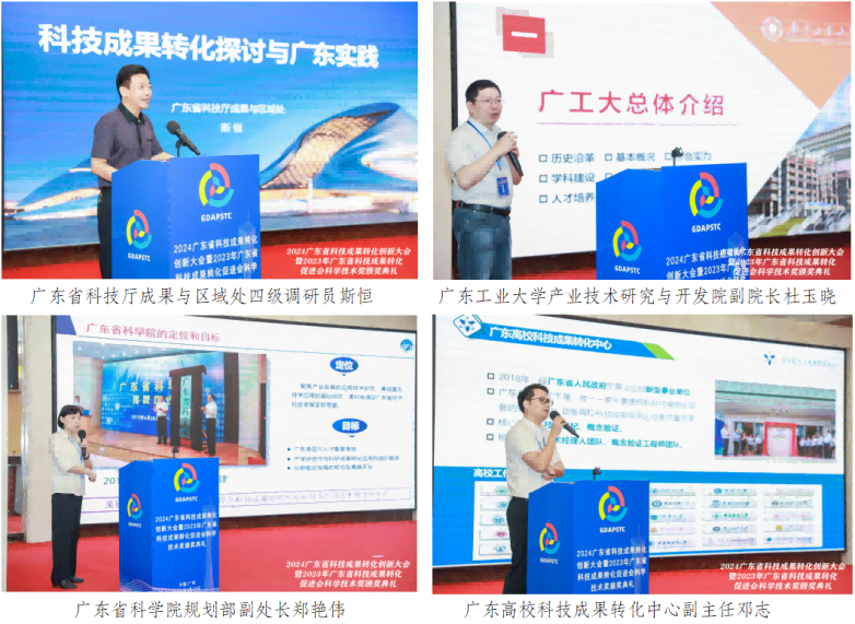 大会邀请了广东省科技厅成果转化与区域创新处四级调研员斯恒、广东工业大学产业技术研究与开发院副院长杜玉晓、广东省科学院战略规划部副主任郑艳伟、广东高校科技成果转化中心副主任邓志分别作了“科技成果转化探讨与广东实践”“广东工业大学科技成果转化路径及模式”“深化改革创新 打造聚焦产业发展枢纽型高端平台助力广东省高质量发展”“高校科技成果路径实践”四个主题报告。四位嘉宾分别从政策、平台、产业、创新、人才方向面对科技成果转化的成功经验与模式作了深度的分析与探讨,分析了当前科技成果转化的现状、问题及对策,为全国的科技成果转化创新发展提供了广东经验。