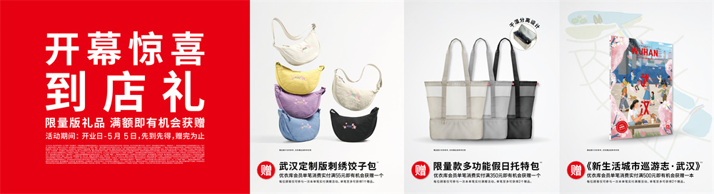 万新齐聚,邀万人燃热爱!优衣库华中首家城市旗舰店,激活商圈新消费潮流!相伴成长十三载,优衣库将通过华中首家城市旗舰店开业,加码武汉消费活力,持续以LifeWear全球创新服装与优质服务,引领华中地区消费者精彩生活!五一期间,华中首个“超燃乐园”空降武汉汉街店,创吉尼斯纪录等巨型T恤、华中首个生机花店、哈利波特魔法巡游秀等超燃体验亮相,更有华中首个UTme!定制工坊,城市乐不同/周黑鸭/二厂汽水等武汉专属创意图案首秀!开业起至5/5,消费者到店享 武汉定制版刺绣饺子包、限量多功能假日托特包、新生活城市巡游志等 多重满赠开幕好礼!