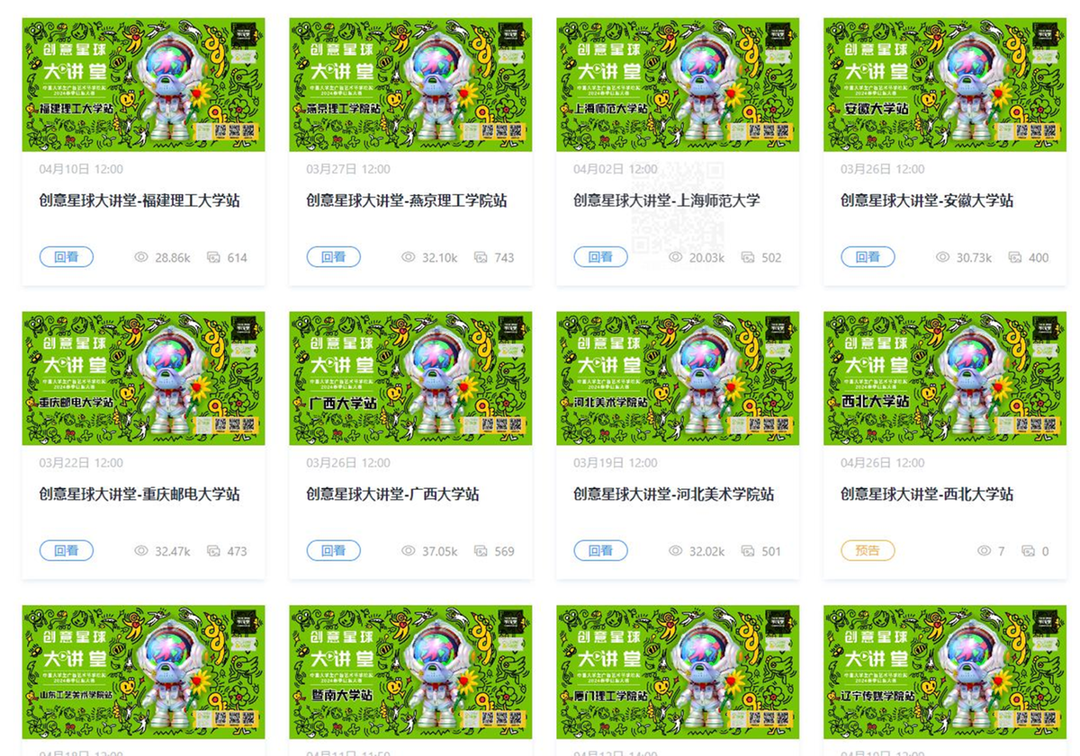 2024年3月15日至4月8日,2024春季创意星球大讲堂·云课堂分别在创意星球网与网易新闻进行4场直播,累计14.57w+人次在线观看、互动。企业和创意大师的精彩分享、组委会工作人员与同学们的答疑交流,让每场课堂气氛都热闹非凡。各种前沿观点和思路金句让同学们获取灵感,赢得师生的一致好评和点赞。