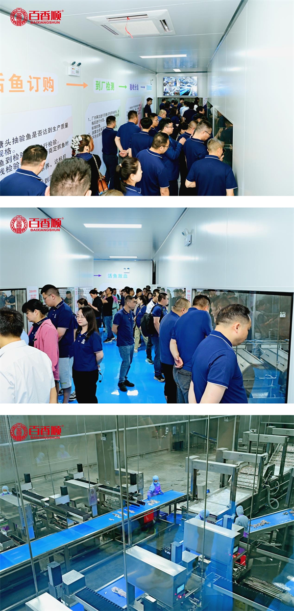开业庆典仪式结束后,陈春旭董事长带领各位领导与嘉宾共同参观新工厂数智化生产线。从参观通道看去,智能化、自动化的鱼片生产流程一览无余,活鱼净化——切片精修——气泡清洗——液氮锁鲜等二十多道工艺流程无不彰显着百香顺对于黑鱼片研发生产的精细研磨,打造出传统行业与现代科技完美结合的新型产业模式。江门新工厂高效强大的生产能力及先进严谨的全流程管理标准,让参观者们连连称赞,让大家对百香顺未来的持续稳健发展充满信心。