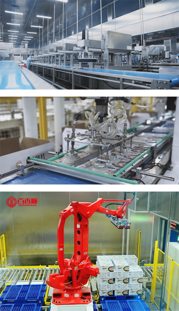科技驱动,赋能生产。江门数智化新工厂遵循GMP标准设计,研发并运用了国内首条无框流水线,采用国际先进的电子秤量系统、液氮速冻锁鲜技术和反渗透净水系统,配备了环境自动控温系统、机械手自动码垛入库及智能化立体冷库系统。以算法驱动精准生产,减少损耗,有效提升生产效率。从此,百香顺有了更强有力的产能支撑,为加速布局全国市场、进军国际市场,持续领跑黑鱼片行业奠定了更加坚实的基础。