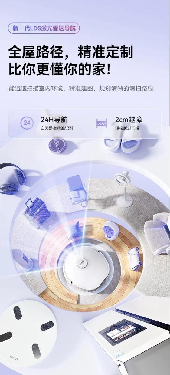采用新一代LDS激光导航技术,能够迅速扫描室内环境,白天黑夜都能精准识别。2cm的越障能力,不被门槛限制,可实现全屋清洁。与此同时,支持连接“以内”APP,一键操控,一次可保存5张地图,支持自定义清扫区域,可自由设置禁区、选区等多种个性化功能。还可连接天猫精灵,小度音箱等进行语音互联,让精致生活易如反掌。