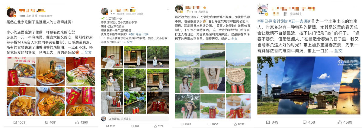 加多宝聚焦出游场景,邀约大众寻宝探春、迎接盛夏,一起赏景、品美食、游民俗活动的初心,即源自情感共鸣。加多宝作为当之无愧的“出行搭子”,以情绪为触点,以文化为纽带,架构话题平台集中了网友在途中获取的文化体验、品尝到的特色美味与美食文化等内容分享,形成社交场域。