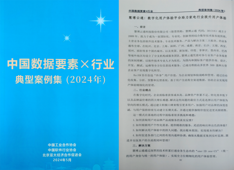 慧博云通在大会上展示了先进的信息技术产品与服务解决方案,同时,公司推出的“慧博云通用户体验管理解决方案”入刊2024中国“数据要素x”行业典型案例集,在活动现场展出,受到众多嘉宾的观看及表扬。慧博云通用户体验管理解决方案基于数字化工作台,从用户服务部门出发,通过实时收集每个用户、每个场景下的真实反馈,将运营数据和体验数据进行融合分析,利用用户问题反向推动用户服务、售后、会员、物流、交易、生产等各环节的业务持续改善,为企业客户提供智能预警反馈,帮助客户及时发现问题源头,快速解决关键问题。这一方案不仅能够助力企业提升精细化运营能力和客户体验管理能力,还能提升客户复购率、客单价和口碑推荐,为企业创造更大的利润与品牌价值。