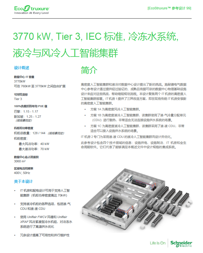 施耐德电气此次发布的99号参考设计,覆盖了存量数据中心改造和新建智算中心的机电系统设计,聚焦设施供电、制冷、IT机房、全生命周期软件四个技术领域,为IT容量高达3770kW人工智能集群提供一套完整的参考设计框架,以满足不同应用场景的需求: