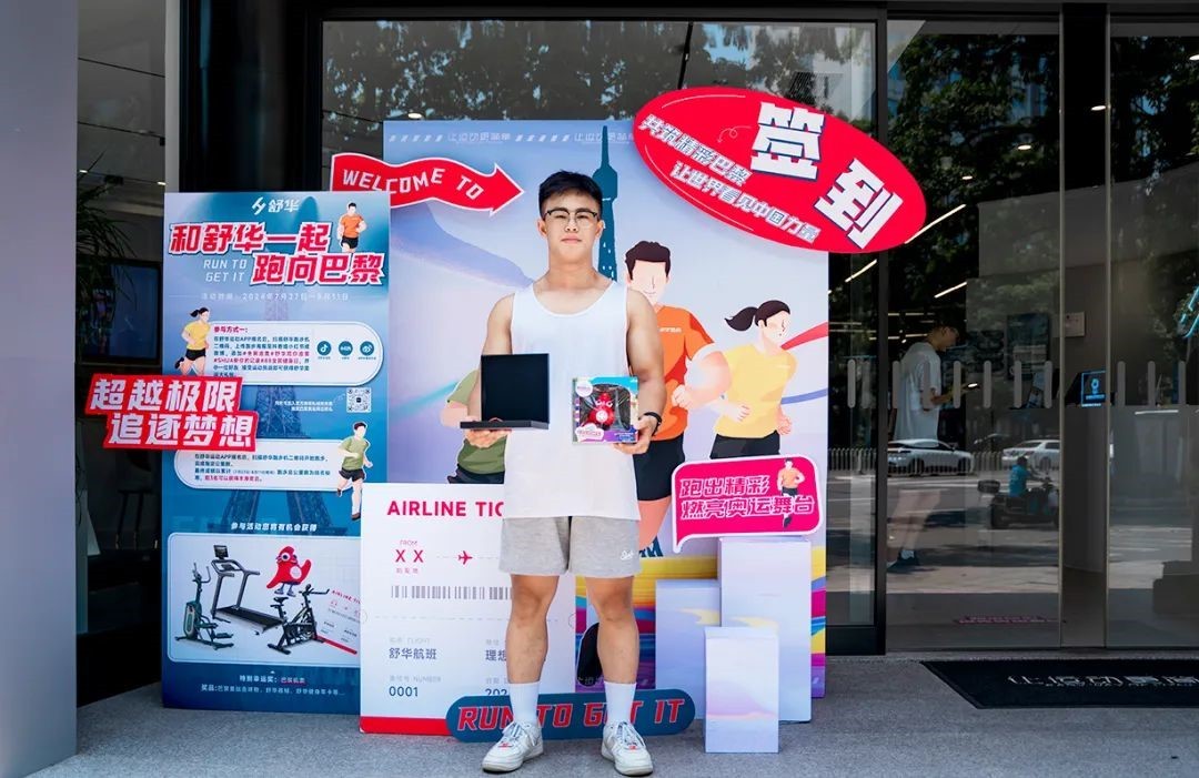 7月27日-8月11日,舒华在全国发起“和舒华一起跑向巴黎”打卡活动,用户不仅可以在线下舒华门店参与活动,还可线上参与社群内打卡,同步抖音、小红书,累计公里数最多的前3名即可获得奖励。