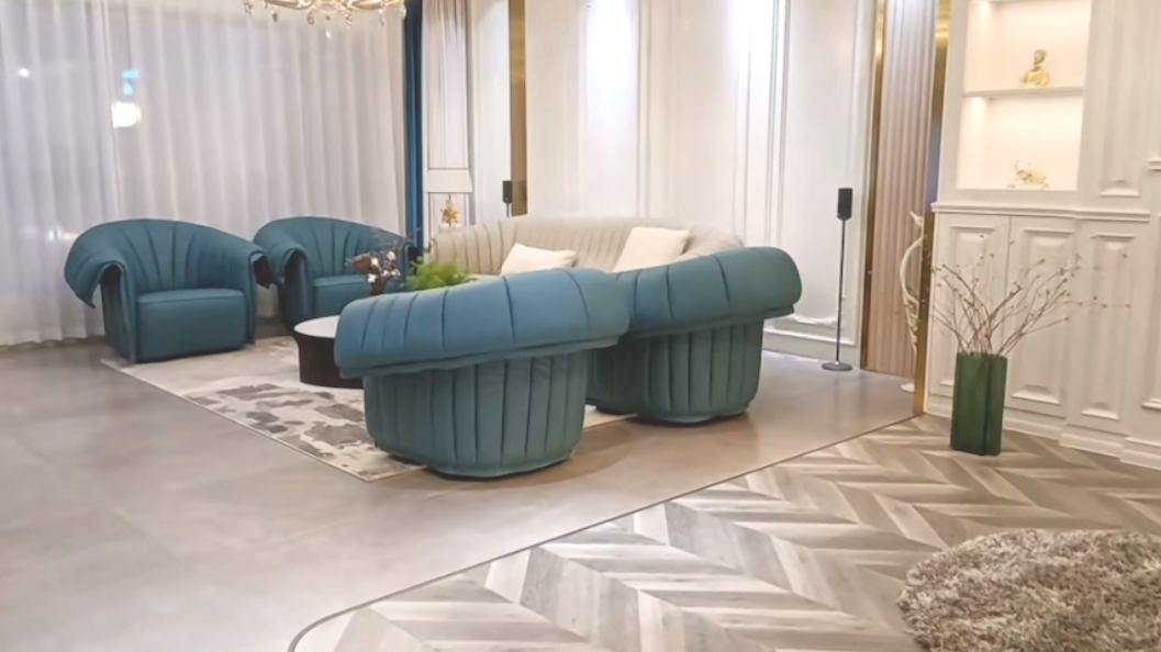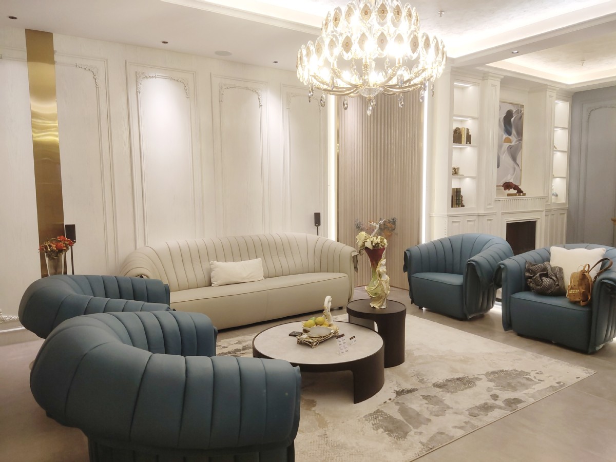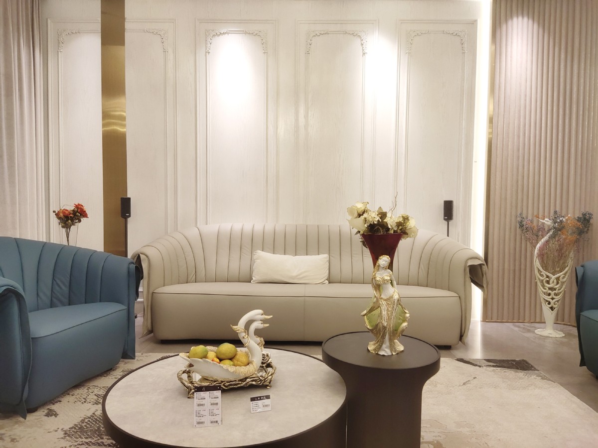 湖蓝色皮质沙发让客户一步入体验区就有眼前一亮的感觉,打破常规沙发颜色,不仅让空间焕然一新,还赋予了一份优雅。