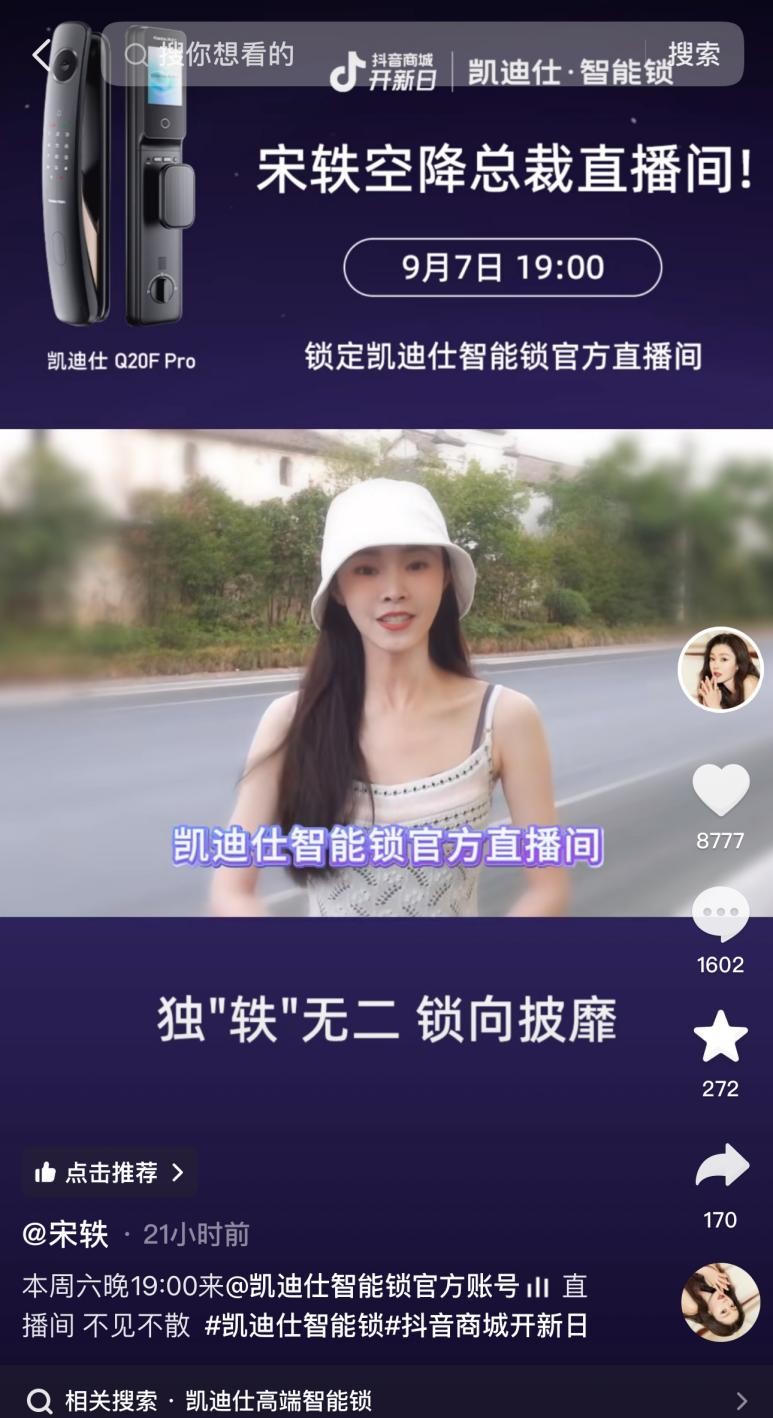 作为凯迪仕品牌新晋“品牌挚友”,宋轶还在个人抖音号发出抖音商城开新日凯迪仕智能锁直播预告。9月7日晚,她将空降凯迪仕智能锁抖音官方直播间,并和粉丝朋友们约定,一起交换智享生活小妙招。
