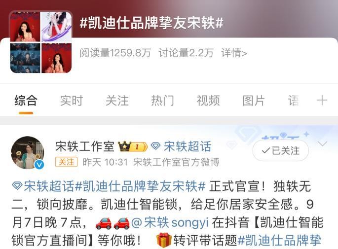凯迪仕此次官宣“品牌挚友”,当日微博话题阅读量即破千万,还吸引了众多自媒体转发分享,粉丝们也纷纷在微博超话打卡祝贺,恭喜宋轶解锁与凯迪仕品牌的新商务,表示要与自己的偶像使用同款智能锁。