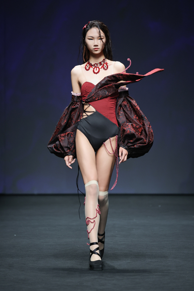 「赛博庞克」系列,设计师SiYee Chan从高科技与低生活水平的未来世界汲取灵感,融合金属、皮革和暗色调,汲取《电驭叛客:边缘行者》的灵感,将电子骨骼和月球元素巧妙融入设计。同时作品挑战性别规范,以性感而强大的造型展现男性的多元魅力,打破传统界限。