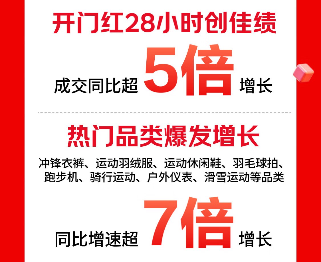 10月16日,京东11.11开卖28小时战报发布,运动鞋服和装备等品类展现出强劲增长势头,成交额同比增长超5倍。其中,冲锋衣裤、运动羽绒服、运动休闲鞋、羽毛球拍、跑步机、骑行运动、户外仪表、滑雪运动等多个品类成交额同比增长超7倍。品牌方面,耐克、亚瑟士、伯希和、麦瑞克、尤尼克斯、lululemon、喜德盛、高驰、BURTON等超过千个国内外知名品牌成交额同比增长超100%,这也显示出消费者对京东高品质运动鞋服和装备的热情和认可。京东11.11期间,京东运动也带来海量超值好物,为消费者“又便宜又好”的购物体验保驾护航。