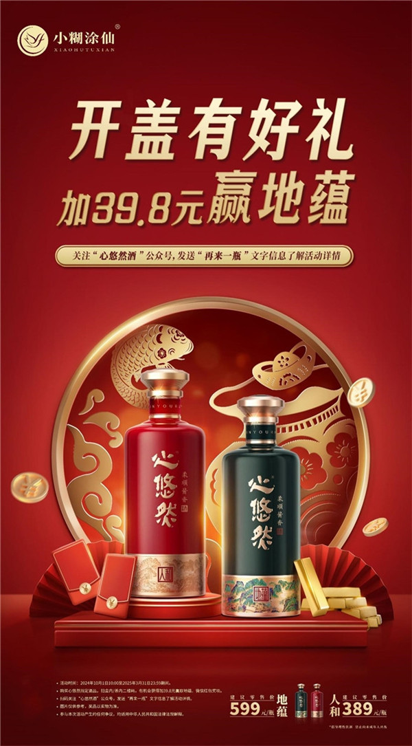 据心悠然品牌方介绍,在2024年10月1日至2025年3月31日期间,消费者开瓶【心悠然·鉴心53度500ml】、【心悠然·鉴境53度500ml】、【心悠然·鉴赏53度500ml】,使用微信扫码扫描酒品瓶盖内二维码,均可获得微信现金红包,同时还有机会获得实物奖品,包括随箱投放的1g、2g实物黄金奖项等。
