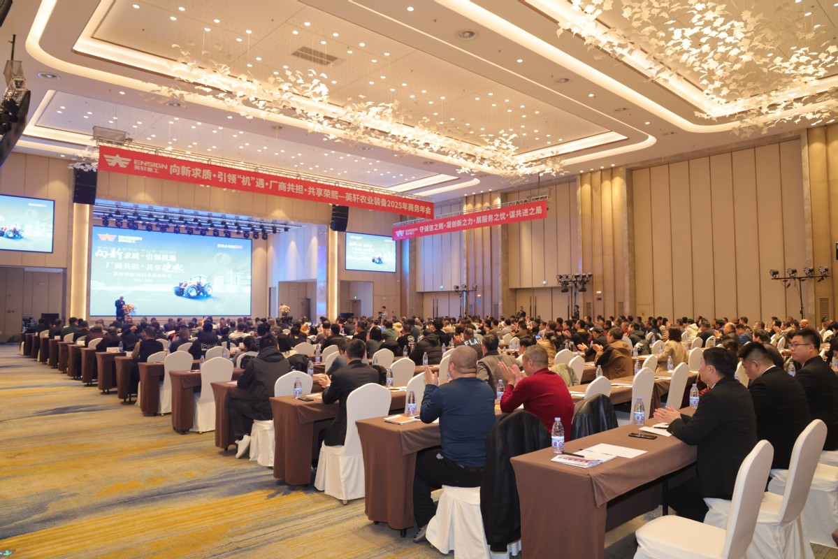 12 月 23 日,2025 年英轩重工农装事业部商务年会于山东潍坊盛大启幕。英轩集团总裁李彦轩、总裁助理季龙坤、英轩重工副总经理兼农装事业部总经理陈敏革携农装经营团队及各级领导,与全国经销商代表共襄盛会。此次年会聚焦回顾 2024 营销成果,明晰 2025 发展蓝图。会议由农装事业部营销公司副总经理丁天培主持。