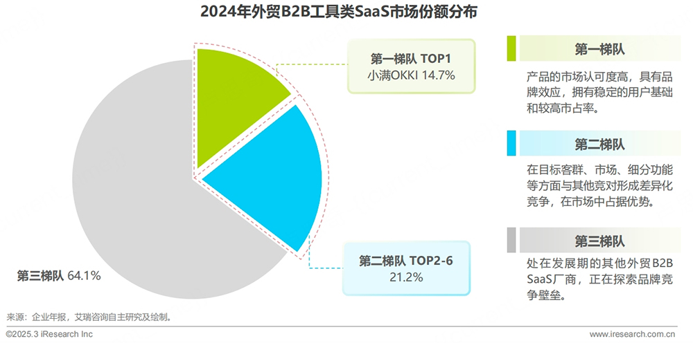 近日,艾瑞咨询发布《2024中国外贸B2B SaaS研究报告》,报告指出阿里国际站旗下外贸生意智能工作台OKKI,以14.7%的市场份额位居“工具类市场第一”。
