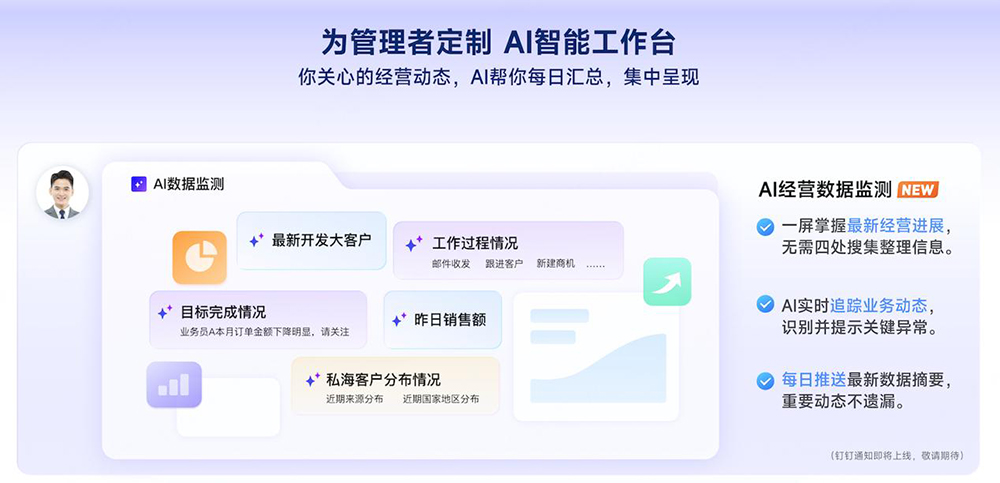 值得一提的是,相较大多数“人去找 AI 工具”的交互方式,OKKI AI 显得更有“人味”,会主动思考,融入外贸人的工作流。简单来说,业务员不用在遇到卡点后,再去调用该模块的 AI 来辅助解决问题。打开 OKKI ,AI 会主动提示每日重点待办,自动跟踪、展示智能营销效果,为业务员精准推送优质潜客。此外,还会基于 AI 背调及历史沟通情况,进行智能客户分层,推送高价值客户跟进策略建议,提示今日必跟商机。而对管理者来说,无需手动调取多维度数据,OKKI 会主动追踪并汇报每日经营动态及团队表现,生成智能分析报告。