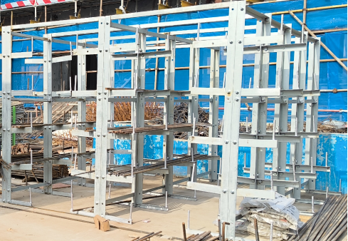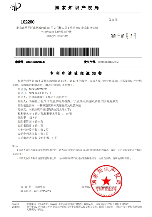 面对施工过程中,钢筋材料浪费严重,钢筋余料利用率低的问题,项目科创小组集思广益,创造发明了一种新型实用专利:一种新型钢筋余料精准利用管理储存架。随着该专利在施工过程中的应用,不同长度的钢筋余料得以分类存放并进行利用,项目材料成本得到降低。