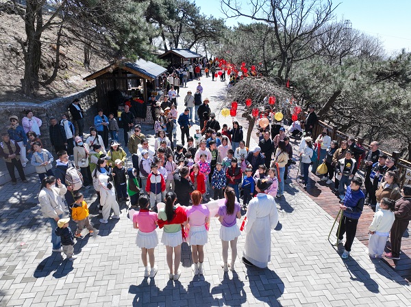 海拔千米的玉津坊平台,云上唱歌班的专业演艺人员以云为幕、以山为席,带领游客共赴音乐盛宴。从《沂蒙山小调》的悠扬婉转,到流行金曲的欢快律动,歌声与山涧溪流合奏,谱写春日的交响乐章。