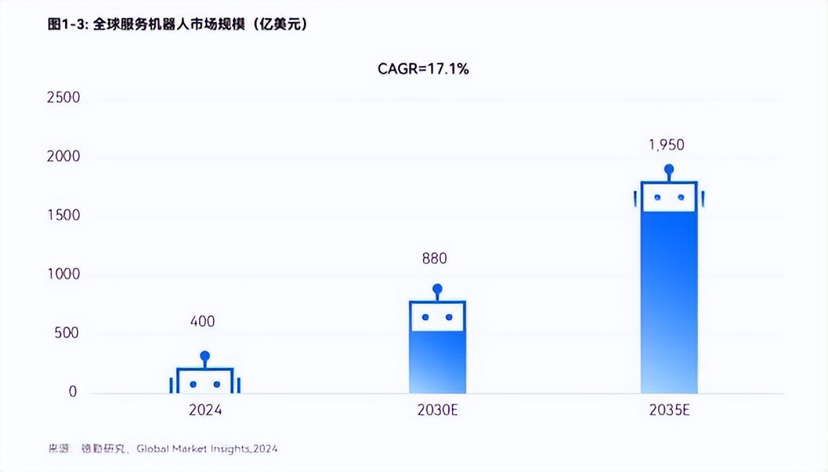 全球服务机器人产业蓬勃发展,产业规模持续增长。报告预测,2025年全球服务机器人(全产业链)市场规模预计达到400亿美元,未来十年将以17.1%的年复合增长率增长,预计到2035年全球服务机器人市场规模有望达到1960亿美元,市场潜力巨大。