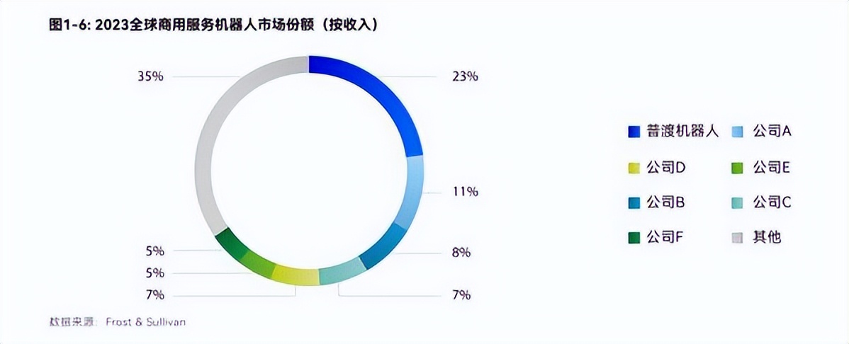 白皮书强调,商用服务机器人行业作为服务机器人行业率先商业化起量的细分赛道,其发展历程对整个机器人行业具有示范引领作用。过去10年行业经历了上半场阶段,如今商用服务机器人行业已进入下半场 ,迎来更加广阔的发展空间。报告援引弗若斯特沙利文的统计显示,2023年普渡机器人以23%的全球市场份额领跑行业, 在全球商用服务机器人 市场中展现出强大的竞争力和影响力。