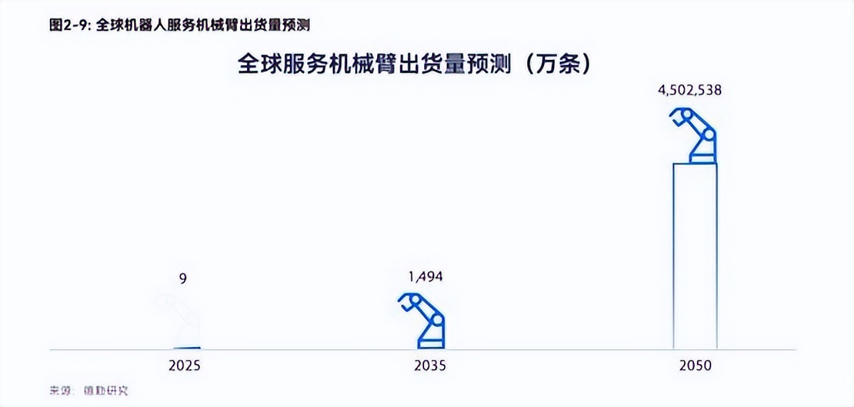以操作能力为例,操作能力是机器人实现通用性和泛化性的关键技术栈。服务机械臂赋予机器人更高的跨场景任务解决能力。根据德勤研究的测算,预计到2050年,全球服务机械臂的市场需求将突破450亿条 ,撬动巨量的市场空间,由此将带动相关产业的蓬勃发展。