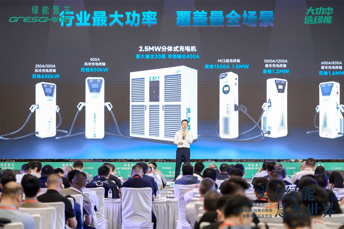 2025年4月18日,“绿脉贯古今——重走新丝路·万里启新程暨春季新品发布会”上,绿能慧充产品技术总监李超发布2025春季重磅新品-绿能·天穹 2.5MW分体式直流充电机。