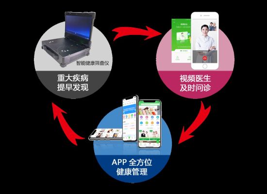 首先运用康乐富智能健康筛查仪提早发现、提早预防;通过手机视频医生,及时问诊;再根据医院医生医嘱,利用健康管家APP进行全方位日常健康管理。
