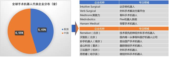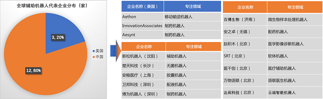 辅助机器人领域,中国企业在数量上具有明显优势,涉足领域更多元。美国企业以制药机器人为主。