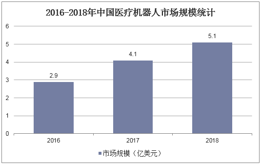 在政策的不断提振下,中国医疗机器人产业飞速发展,2018年市场规模为5.1亿美元,同比增长24.4%。