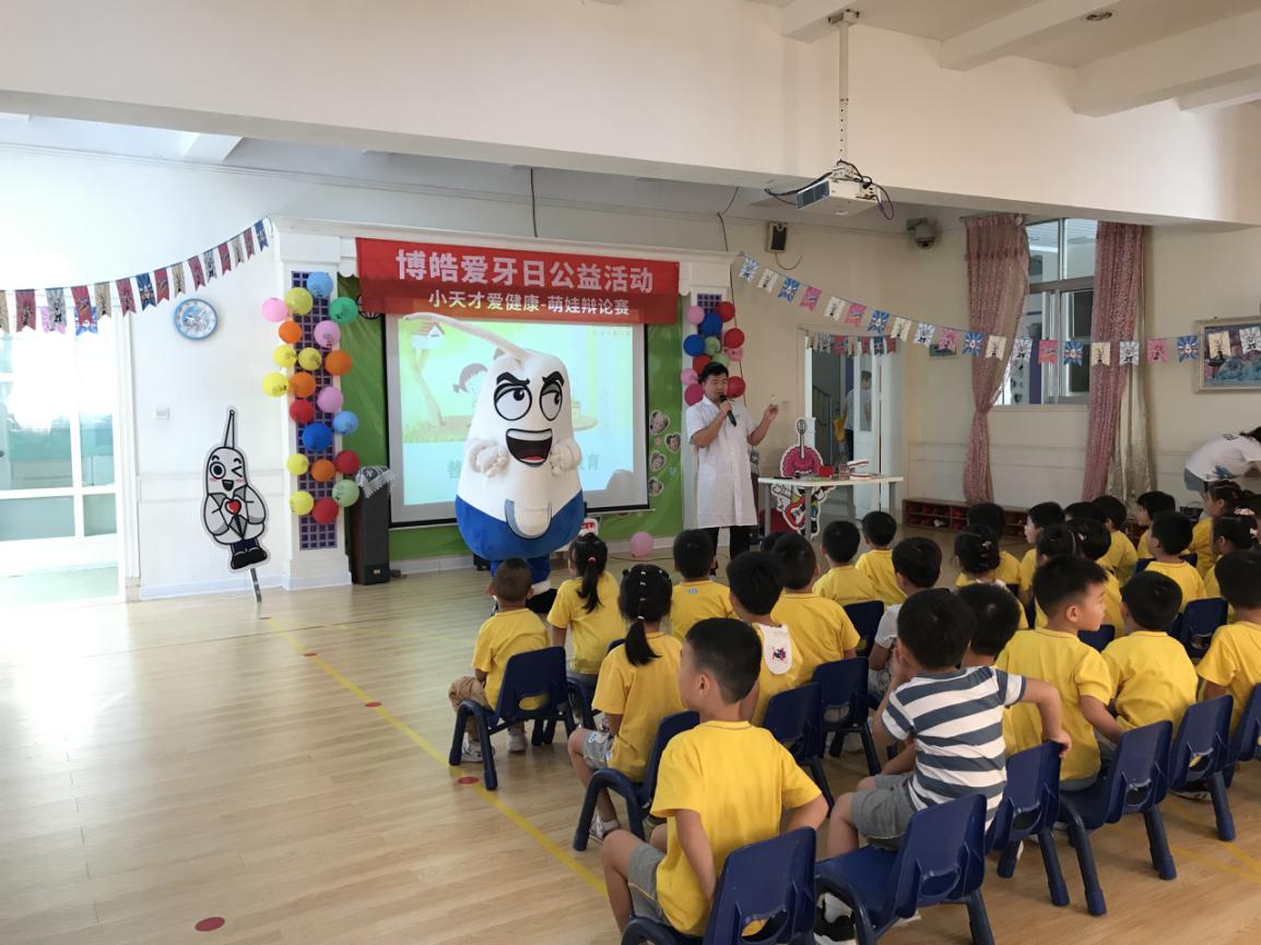 活动一开始,博皓邀请到青苗儿童口腔的牙科医生为小朋友带来了一堂精彩实用的口腔保健知识课,博皓的IP人物皓小冲也现身课堂,用幽默生动的表演向小朋友们介绍了爱护牙齿的重要性,并现场为他们一一检查牙齿。