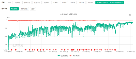 七麦数据显示,自2015年11月至今,企查查在APP下载排行上始终处于第一的位置。