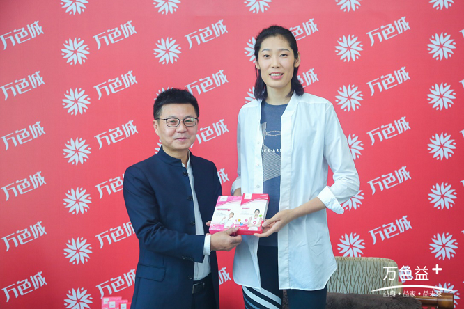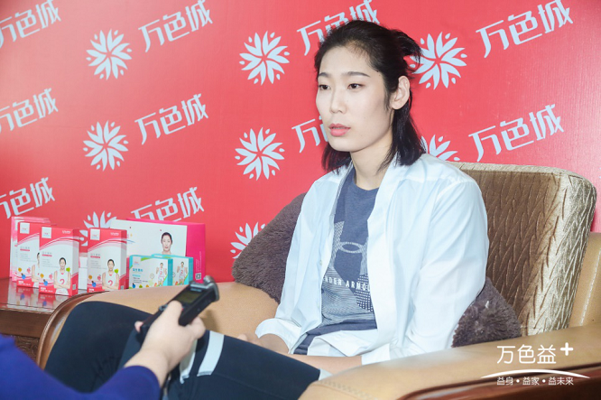 (万色益+品牌代言人、中国女排国家队队长朱婷在现场接受采访)