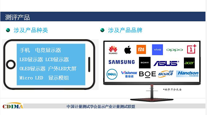 本次测试涉及产品种类包括手机、电竞显示器、LED显示器、LCD显示器、OLED显示器、户外LED大屏、Micro LED和显示模组,产品品牌包括华为、苹果、小米、vivo、oppo、三星、索尼、one plus、华硕、宏基、戴尔、维信诺、京东方、铂睿和汉德森。