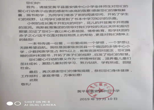 贵州黄平县重安镇重安中心小学是国家级贫困县的一个偏远乡镇的中心小学,少数民族学生占到80%以上,教育资源相对困乏。在接收到爱学习的无条件捐献的教材后,学校第一时间发来了感谢信:“一本书传递一份爱,一份爱成就一个梦想,一个梦想让希望无限启航……你们捐赠的资料和图书,开拓了孩子们的视野……将作为一种精神财富,滋养孩子们茁壮成长。“。
