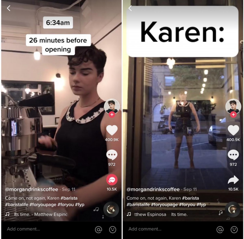 比如,有的TikTok视频会从一部电影中挑出一段话,用它对截然不同的事情开玩笑。摩根·爱克洛斯(TikTok昵称@morgandrinkscoffee)在俄勒冈州科瓦利斯镇的一家咖啡厅工作。她在一条视频中借鉴了乔丹·皮尔的电影《我们》。这部电影的插曲是Luniz的《I Got 5 on It》。电影将其改编成慢速版本。爱克洛克在视频里借用了这段恐怖的音乐,以及制造出影片里令人紧张的节奏和氛围,用来吐槽天刚蒙蒙亮时,冷不防被咖啡店门口等待的顾客吓到的情况。