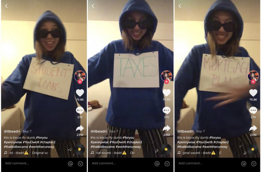 阿德里安娜·查维斯(TikTok昵称@itbeadri)拍摄的一条视频中,想象了恐怖电影续集《小丑回魂2》的一个版本:邪恶小丑Pennywise更多地表现了“成年人的恐惧”:缴税、房贷、助学贷款等等。