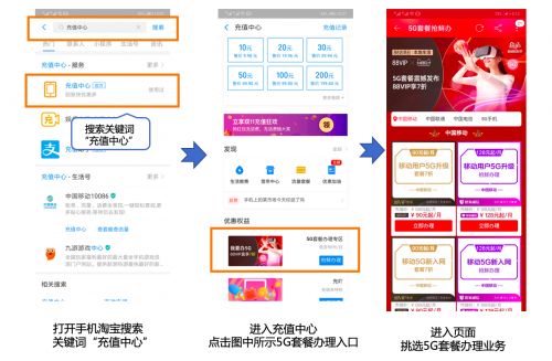 同时,5G套餐的办理方式也非常简单。用户打开“手机淘宝”,搜索“我要办5G”,点击进入5G办理页面,或者打开“支付宝”,搜或找“充值中心”,点击页面里的“我要办5G“优惠权益,即可快速了解三大运营商的5G套餐业务详情,挑选心仪的套餐。其中,中国移动、联通的5G商用套餐已覆盖全部开放5G网络的地区,支持新老用户办理。