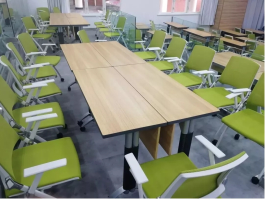传统阶梯教室桌椅固定,学生分组困难,小组讨论阶梯教室打破一阶一排格局,将两层阶梯合并为一层,学生们既可以分成两排听课,也可合并成大桌进行小组讨论,还可通过newline会议平板辅助学习。