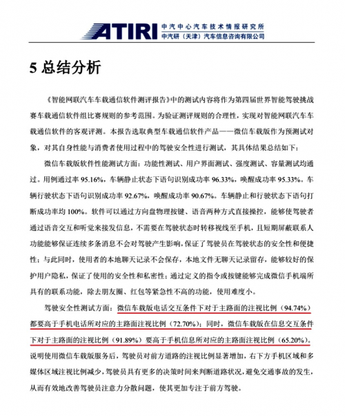 在此次权威测试中,从驾驶安全性测试数据可以看出,相较于使用手机电话和车内多媒体功能,驾驶者在使用微信车载版服务后,对前方道路的注视比例显著增加,对驾驶位右下方多媒体区域注视比例减少,有效地改善驾驶人注意力分散,使其更加专注于前方驾驶。