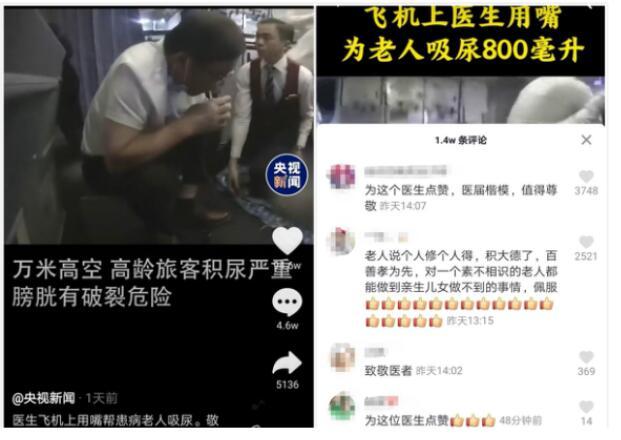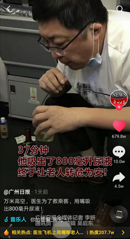 昨日,一条“万米高空,医生为救乘客,用嘴吸出800毫升尿液”的视频在抖音刷爆,迅速登上抖音热榜,仅11个小时,观看量飙升至649.8万。