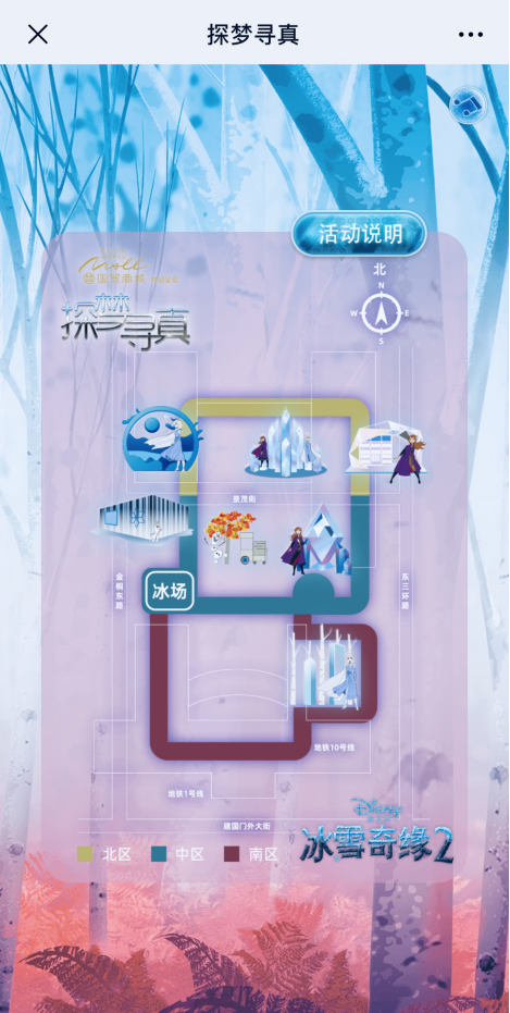 2019年11月22日-2020年1月3日期间,国贸商城同步2019《冰雪奇缘2》主题展上线《探梦寻真》H5游戏,线上线下全面贯通,乐趣不断。玩家可通过游戏提示,寻找隐藏在各个点位装置的二维码,解锁现场场景,并赢取《冰雪奇缘2》雪花行李牌,数量有限,先到先得。