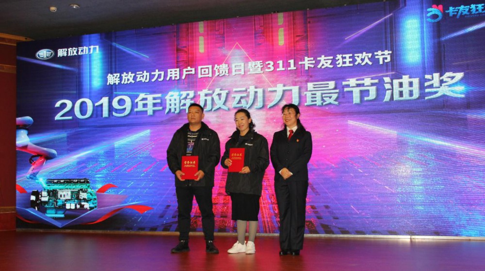 (一汽解放发动机事业部党群部部长助理邵艳娟为2019年解放动力最节油用户代表颁奖)