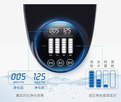 能如此清晰显示滤芯寿命,显然已经可以满足一般消费者的需求。但作为专业净水品牌,美国科乐泽的追求显然不止如此。为了让用户更清晰掌握水质改善情况,科乐泽直接智能数显水质情况,用户可以清晰看到净化前后水质TDS水质,不仅一手掌握水质情况,也通过强后对比,清晰了解水质改善情况,喝起来更放心。