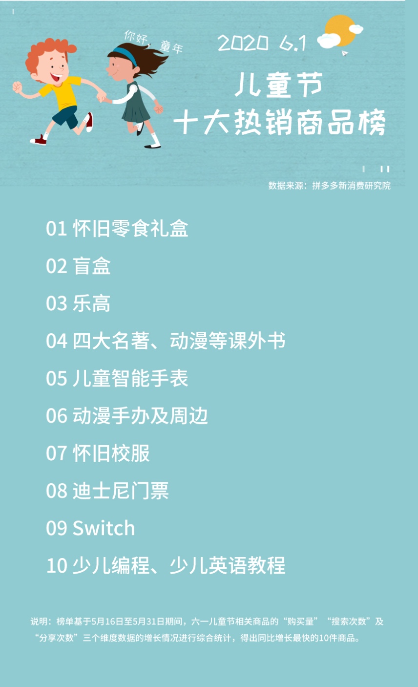 新电商平台拼多多发布的《儿童节十大热销商品榜》对5月16日至5月31日期间,平台涉及“六一”“儿童节”“六一礼物”等关键词商品的订单进行统计,最终“怀旧零食礼盒”“盲盒”“乐高”登上前三位。