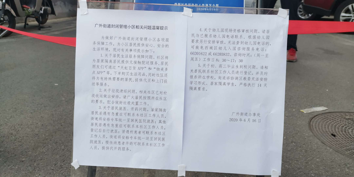 6月16日,北京市召开的新冠肺炎疫情防控工作新闻发布会通报,6月14日,广外天陶红莲菜市场有一名往来新发地市场人员被确诊为新冠肺炎病例,其活动轨迹涉及天陶红莲菜市场及周边。遂决定自6月16日凌晨2:00起,对广外街道乐城、鸭子桥、车站西街、车站西街15号院、青年湖、手帕口南街、京铁和园7个社区的居住小区实施封闭管理措施。