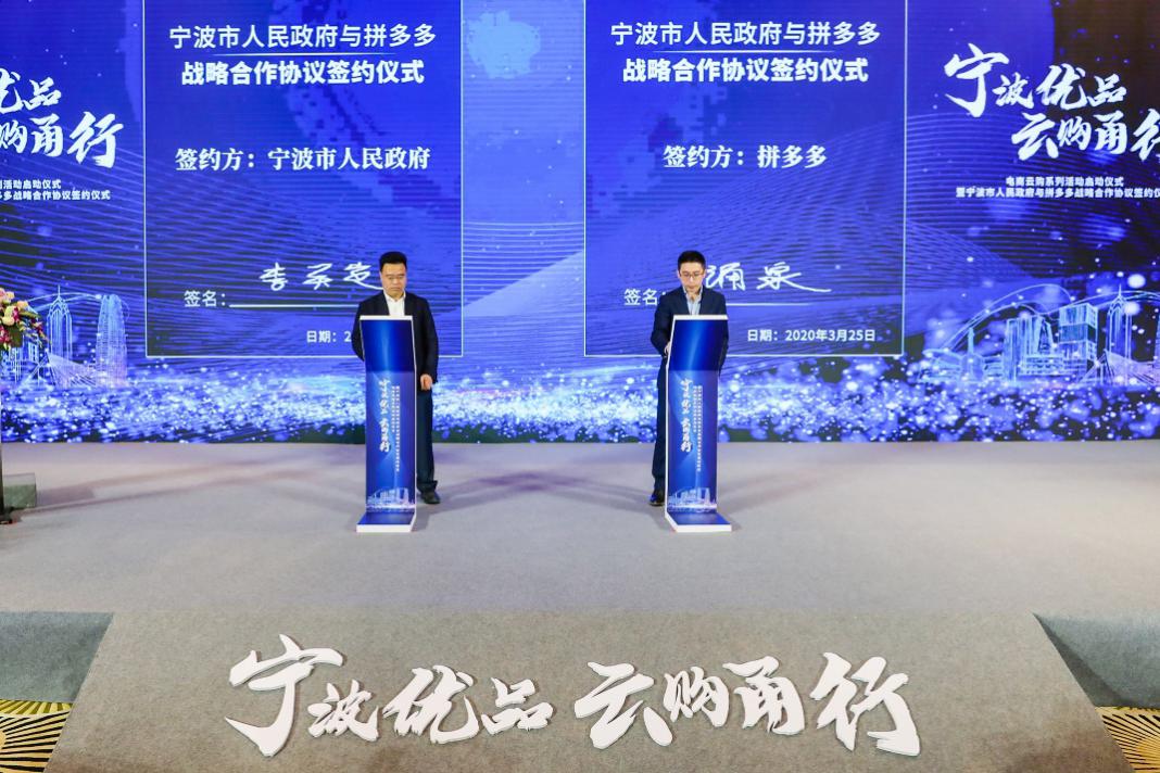 ▲3月25日,宁波市副市长李关定(左一)与拼多多副总裁涌泉(右一)作为双方代表,签署战略合作框架协议。(摄影 安舜)