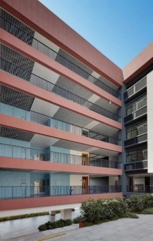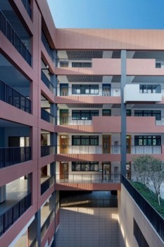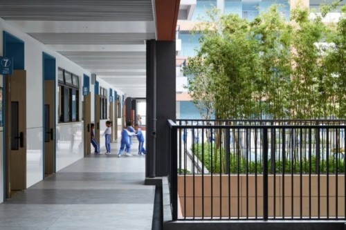为了符合现代学校教育需要大量公共交流活动空间的特点,设计师通过首层及二层多处架空空间的设计,既沟通了院落之间的联系,又获得了更多的半室外活动空间,并通过精心的景观布置,成为师生间主要交流互动的平台。
