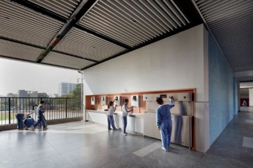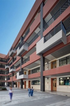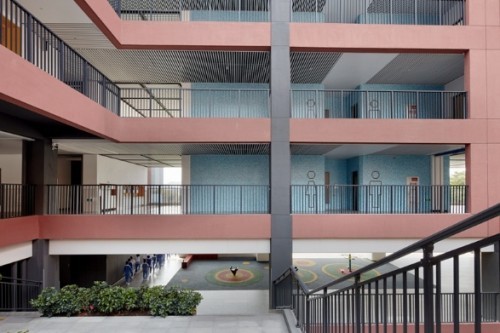 建筑外观设计上,贯穿外立面的砖红作为校园的基调色,室内配以大面积白色,使建筑的体块关系更为明显,并很好的勾勒出建筑的轮廓线条。