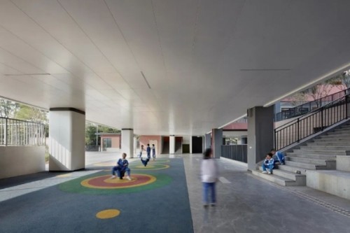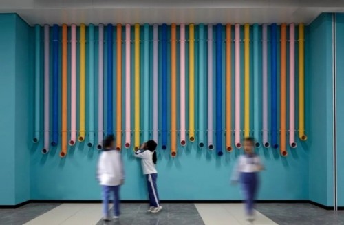 公共空间主要承担了联结社交互动、交通流线的功能。不同形式的活动区、过廊等,作为小朋友课间游戏和聚集区域,以色彩与标识为区分,让人在课余充分放松、娱乐。设计师也为学校规划了后期投入使用后的文化建设与配套设计,这里有学校艺术与文化的延续,有运动场所的延伸,有互动交流的区域,有虚拟围合的空间……随着学校的使用,这里将展出老师和学生进行文化交流、互动的一个个精彩瞬间。
