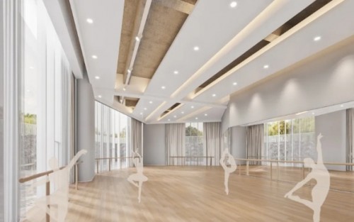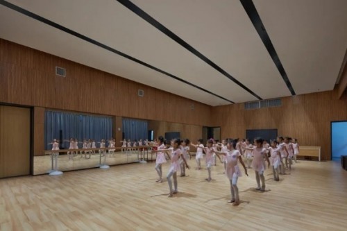 设计以科学严谨的分析研判作为基底,强调围合感、趣味性、艺术感,透过对校园环境与教学品质关系的思考、梳理,在不同的空间选用适配的形式。舞蹈室门口贴心设置了方便换鞋的鞋柜矮凳一体装置,室内则由大面积吸音板和专业塑胶地板构成,两面的银镜保证对舞者动作的观察,其镜面、把杆的尺寸设计都经过了科学严谨的测量,同时镜面效果除了方便练舞时对照动作,亦予人空间视觉延伸的宽阔感。