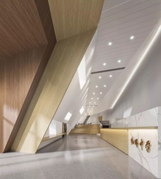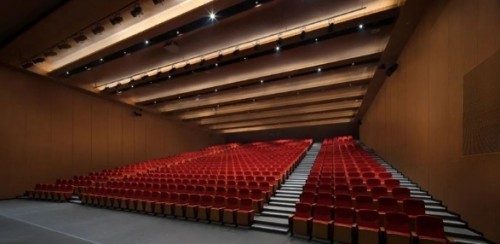 声乐室与报告厅的墙面设计均为木纹冲孔板与平板交错结合的方式,在达到吸音效果的同时,最大限度保证声音的还原,保证更好的音质效果。报告厅采取叠级天花藏灯设计,专业配置的不同灯光系统,可满足会议、表演两大不同需求,简约而高雅。里外两级幕布的设计,让空间层次更加丰富,而阶梯式座椅的设计则大大提高空间利用率与观赏效果。